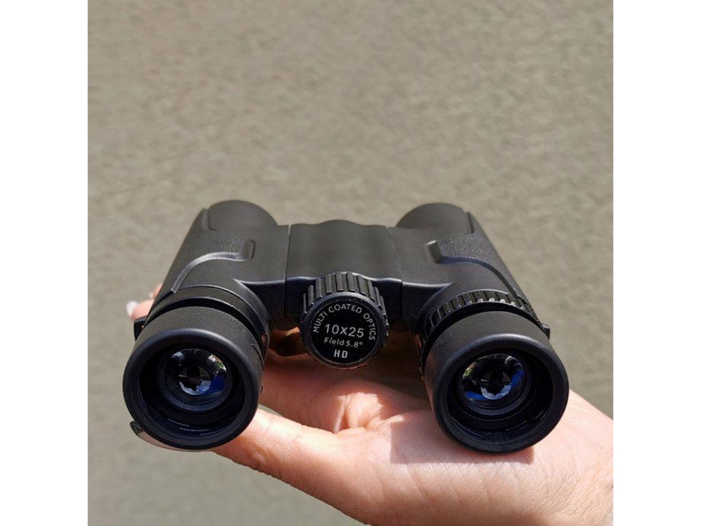 Dalekohled má 10x zvětšení při průměru objektivu 25 mm.